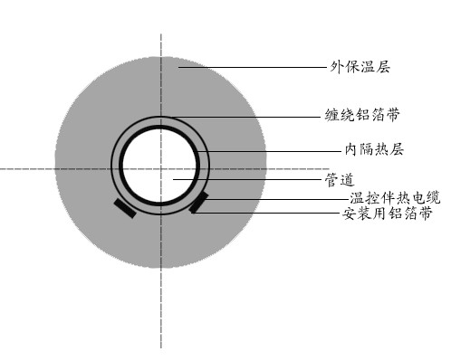 由于蒸汽掃線(xiàn)時(shí)間相對(duì)較短。一般控制在30分鐘左右。可采用下圖雙層保溫結(jié)構(gòu)來(lái)保證使用。一般來(lái)說(shuō),這種結(jié)構(gòu)的內(nèi)層保溫厚度為5-10mm.在內(nèi)保溫層外加包鋁膠帶,鋁膠帶上敷設(shè)自控溫電熱帶。每毫米內(nèi)層保溫層可使掃線(xiàn)溫度減低10℃左右,或采用隔離支架,每米1—2只,效果也較理想。當(dāng)然,在掃線(xiàn)時(shí)必須停止通電,管線(xiàn)熱損失仍按常規(guī)設(shè)計(jì),保溫層厚度只能按外層為計(jì)算厚度。