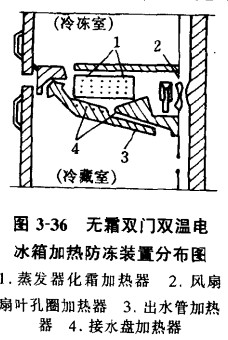 加熱防凍裝置蛀牙用于間冷式無霜電冰箱中,而在直冷式電冰箱中應(yīng)用相對較少一些。其主要作用是:保證各控制系統(tǒng)正常工作;保護(hù)箱內(nèi)結(jié)構(gòu)及保證食品衛(wèi)生。常見的加熱防凍裝置有:接水盤加熱器、出水管加熱器、風(fēng)扇扇葉孔圈加熱器和溫感風(fēng)門溫控器殼體加熱器。它們在間冷式電冰箱內(nèi)的分布位置如圖3-36所示。溫感風(fēng)門溫控器殼體加熱器位于溫感風(fēng)門溫控器的外殼表面,圖中未標(biāo)出。