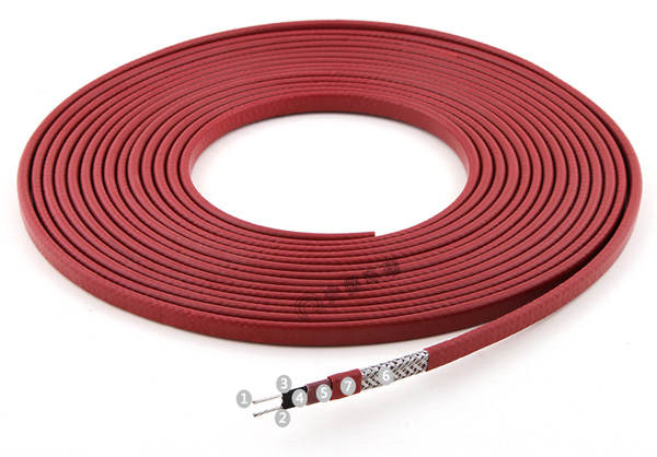 1、銅芯導線 2、低電阻過渡層 3、PTC芯帶 4、改性聚烯烴絕緣層 5、改性聚烯烴絕緣層 6、金屬屏蔽層 7、低煙無鹵外護套(可定制氟塑料護套)