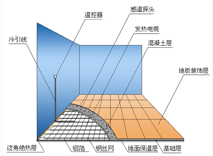 通過鋪設(shè)于地板上的地溫探頭或溫控器內(nèi)的室溫探頭,由房間溫控器控制溫度。當(dāng)室內(nèi)溫度達到設(shè)定值后,溫控 器開始動作,斷開發(fā)熱電纜的電源,發(fā)熱電纜停止加熱,當(dāng)室內(nèi)溫度低于溫控器設(shè)定值時,溫控器又開始啟動, 接通發(fā)熱電纜的電源,發(fā)熱電纜開始加熱,這樣往復(fù)運行。